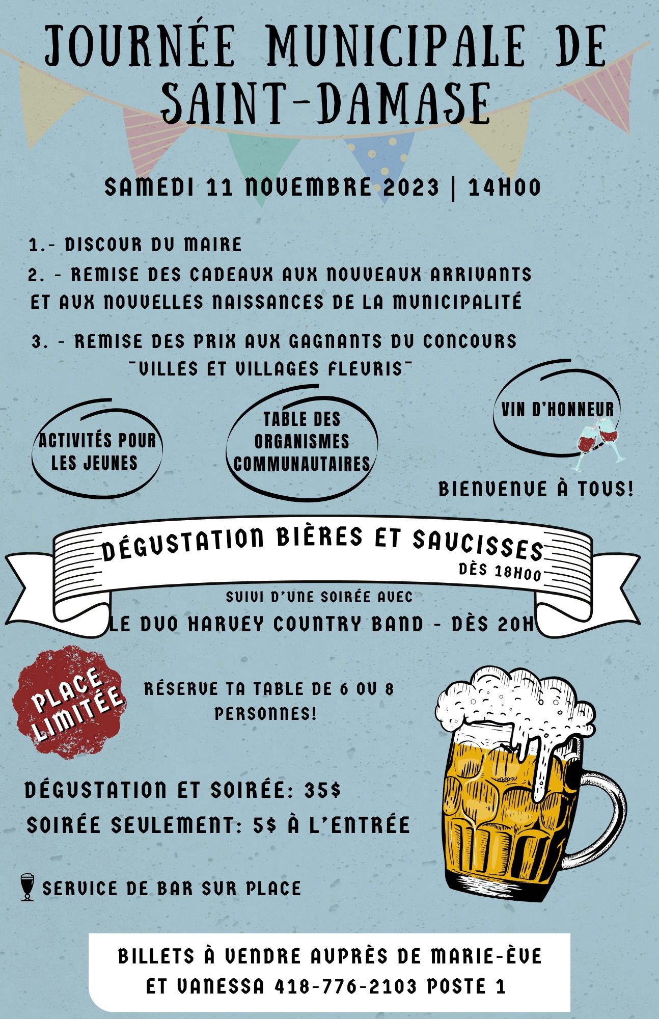 Journée municipale de Saint-Damase le 11 novembre dès 14h. Places limitées, faites vite!