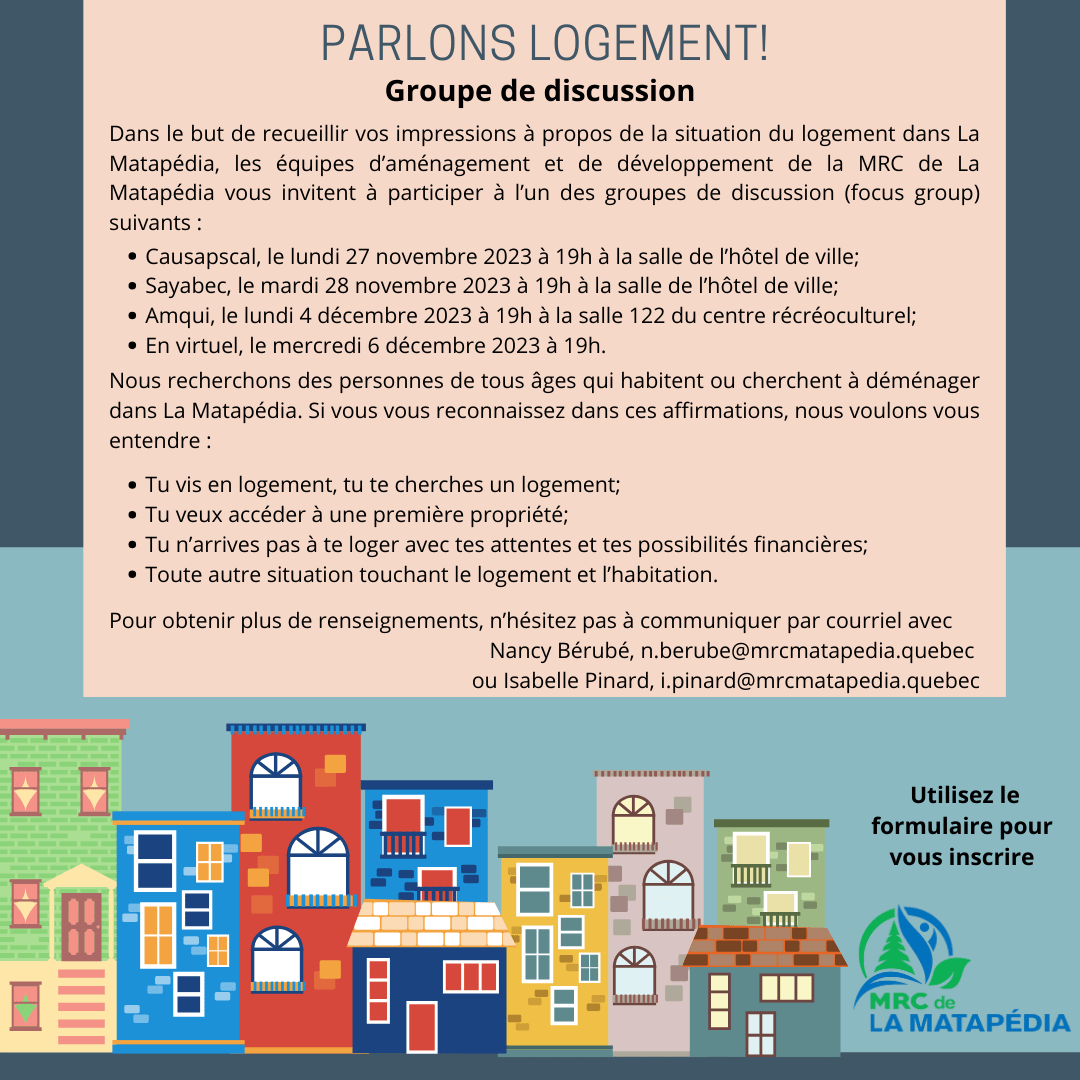 Dans le but de recueillir vos impressions à propos de la situation du logement dans La Matapédia, les équipes d'aménagement et de développement de la MRC de La Matapédia vous invitent à participer à l'un des groupes de discussion (focus group) suivants :