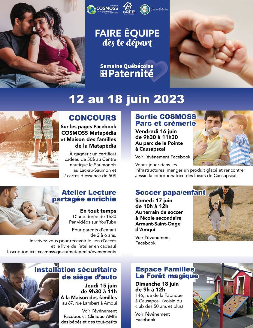 Activités matapédiennes dans le cadre de la Semaine québécoise de la paternité. Cliquez sur le visuel pour voir toute la programmation!
